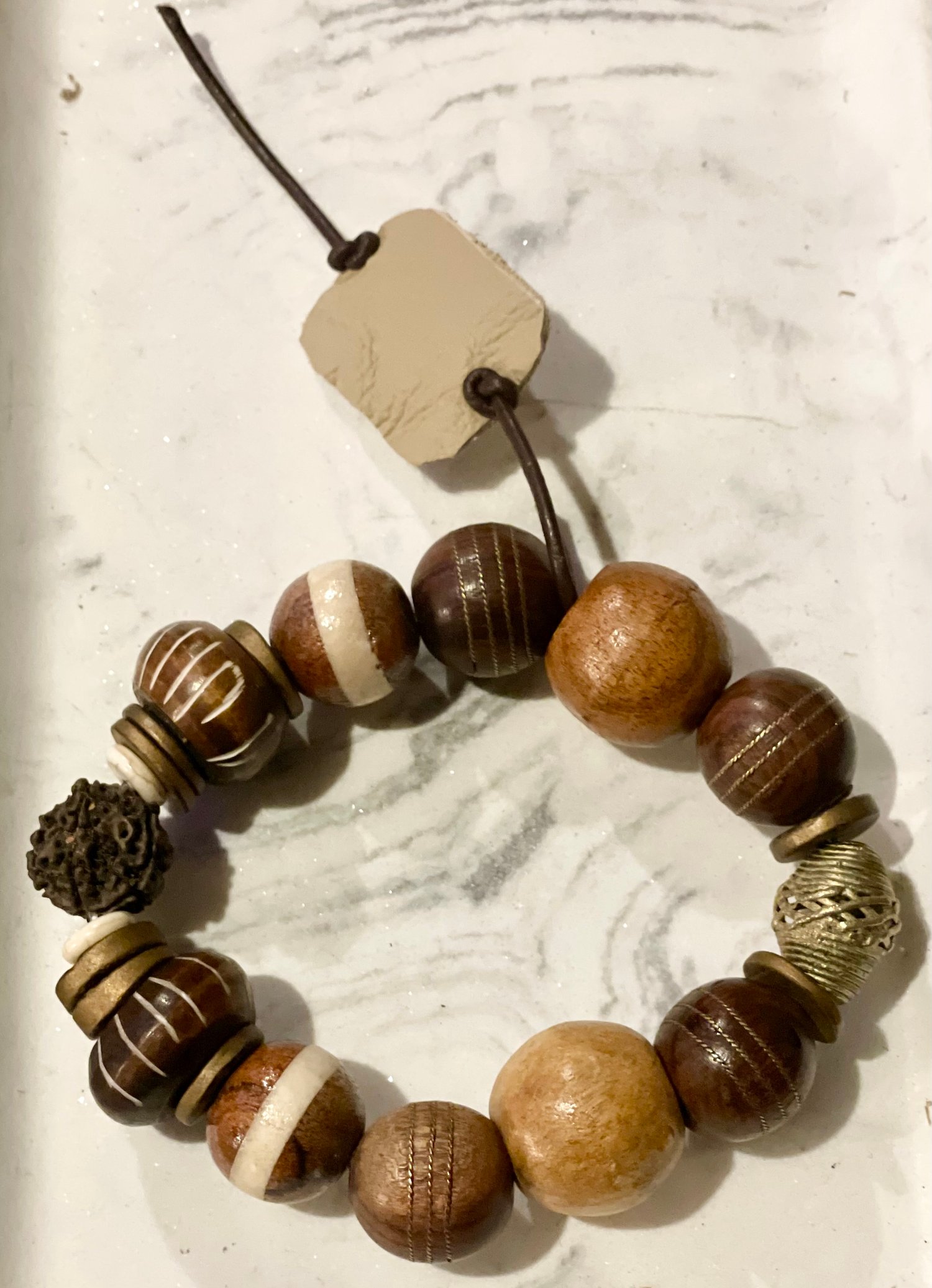 The wooden beads inlaid with brass and bone form the body of the guard, echoing the wisdom of the land and the resilience of the ancestors. Brass speaks of endurance and royalty; bone whispers of lineage and spiritual continuity.